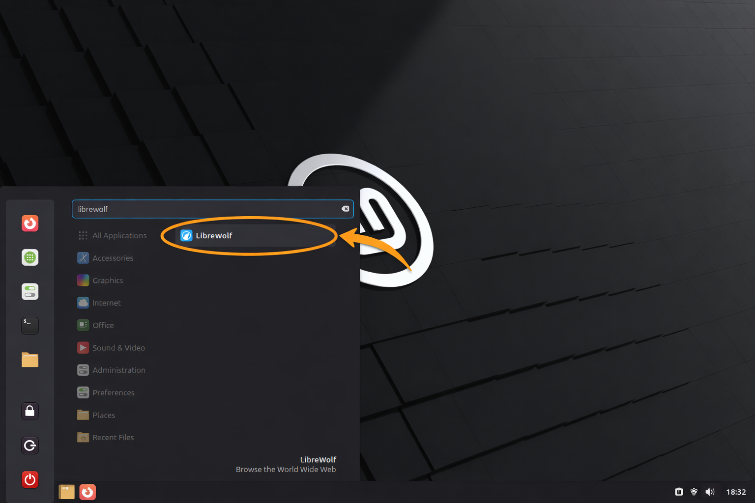 Locate LibreWolf in your Applications Menu under Internet or use the system search: