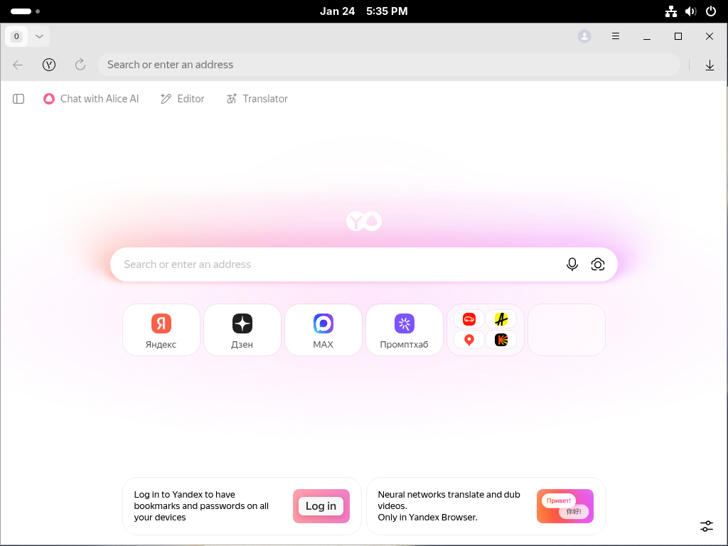 Search for “Yandex Browser” in Activities and open it from the applications grid.